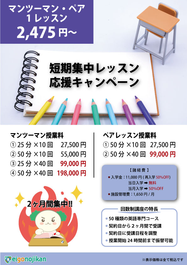 - 白金高輪校では、マンツーマン25分×4回 月謝11,000円(税込)や、ペアレッスン50分×4回 月謝11,000円(税込)の月謝制講座が人気です。新規入学者を対象に、入学金無料&初月月謝無料キャンペーンを実施しています。 短期集中プランは、マンツーマンやペアレッスンが入学金無料&授業料10%OFFで受講できます。回数制講座は、夏休み(夏季講習)、冬休み(冬季講習)短期受講も可能です。